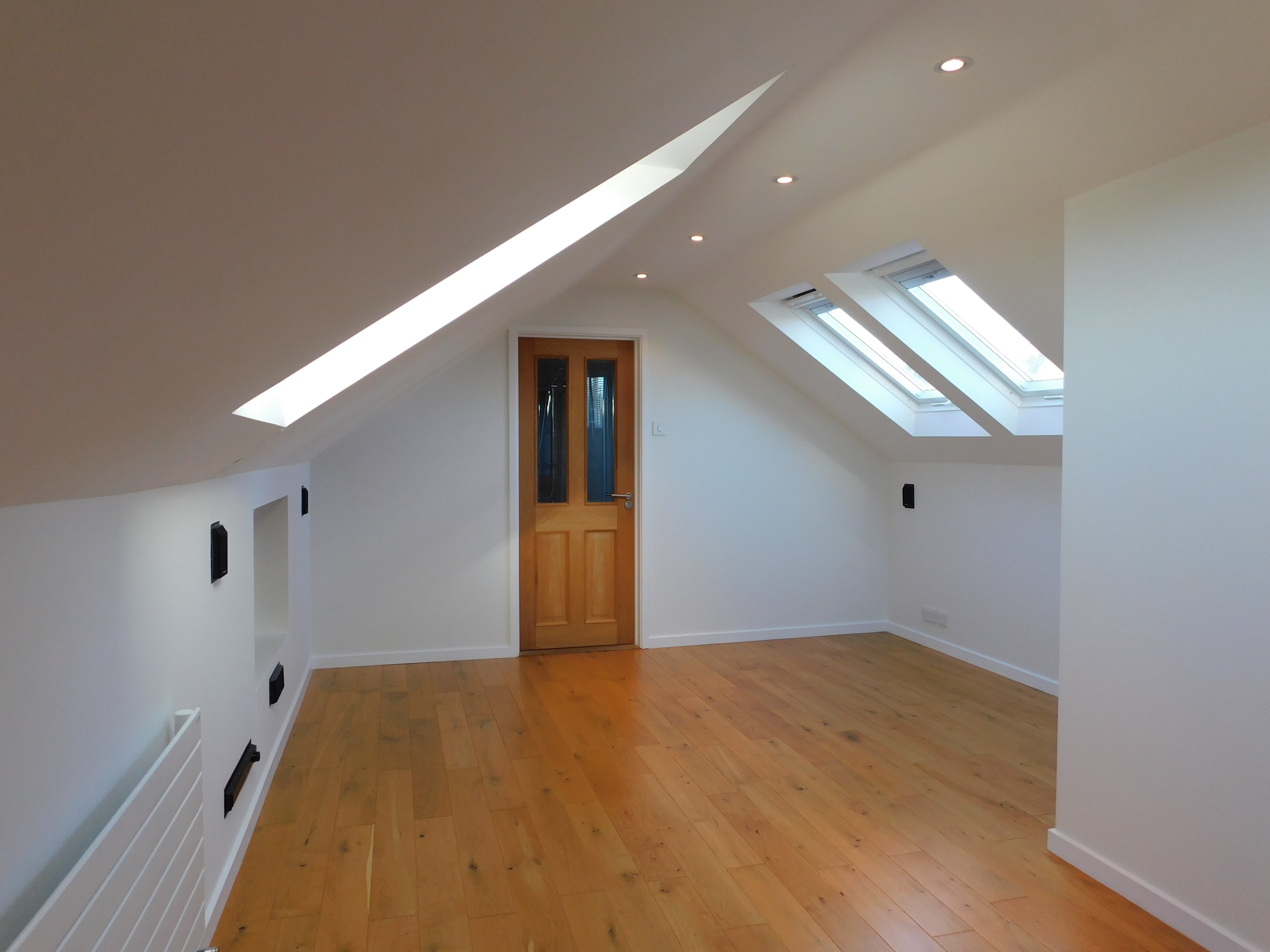 BEDROOM 3 (master): Skylight windows to front and rear with remote control blinds, sound system, radiator, wooden flooring, ensuite shower room.