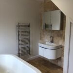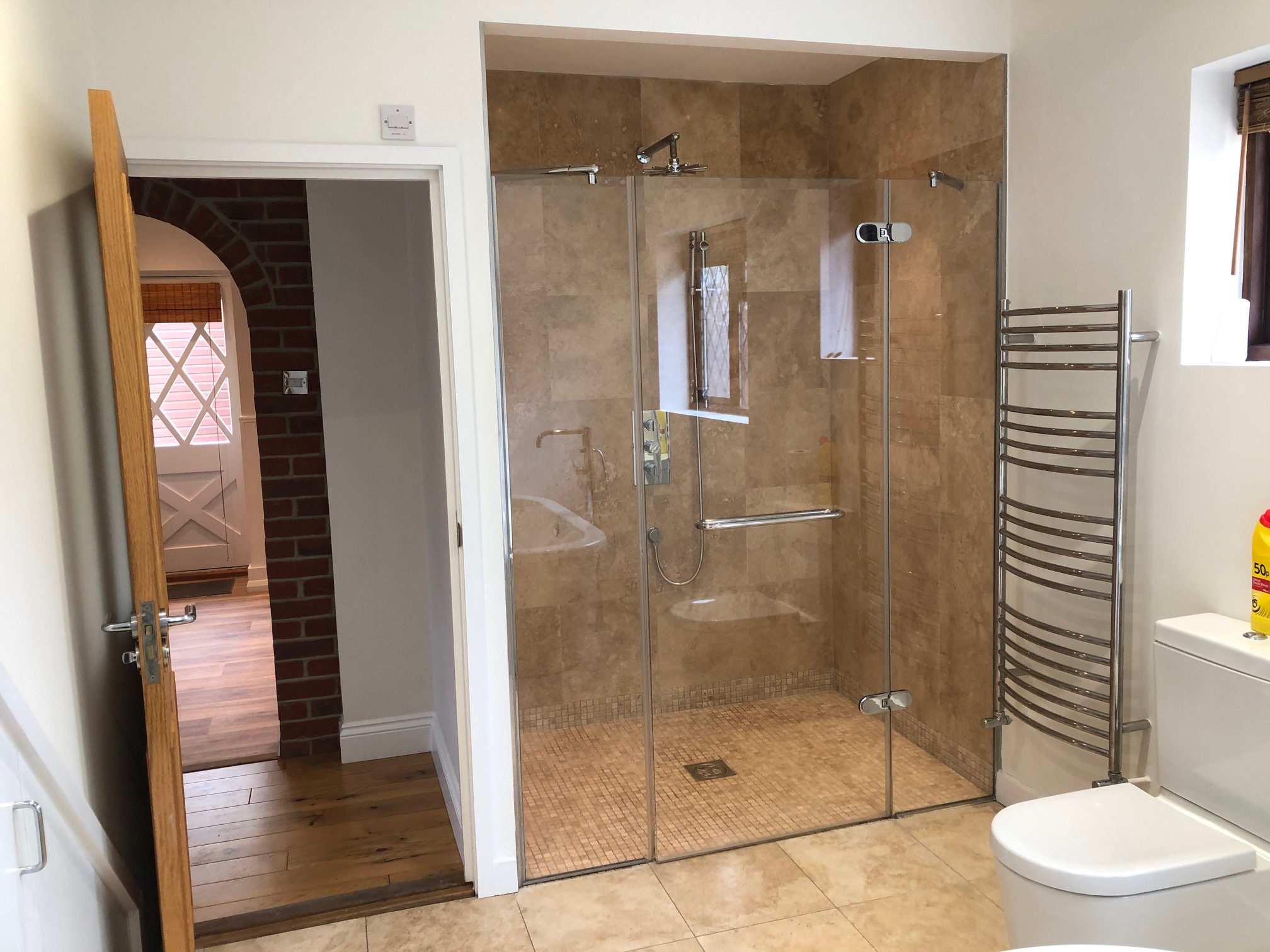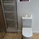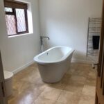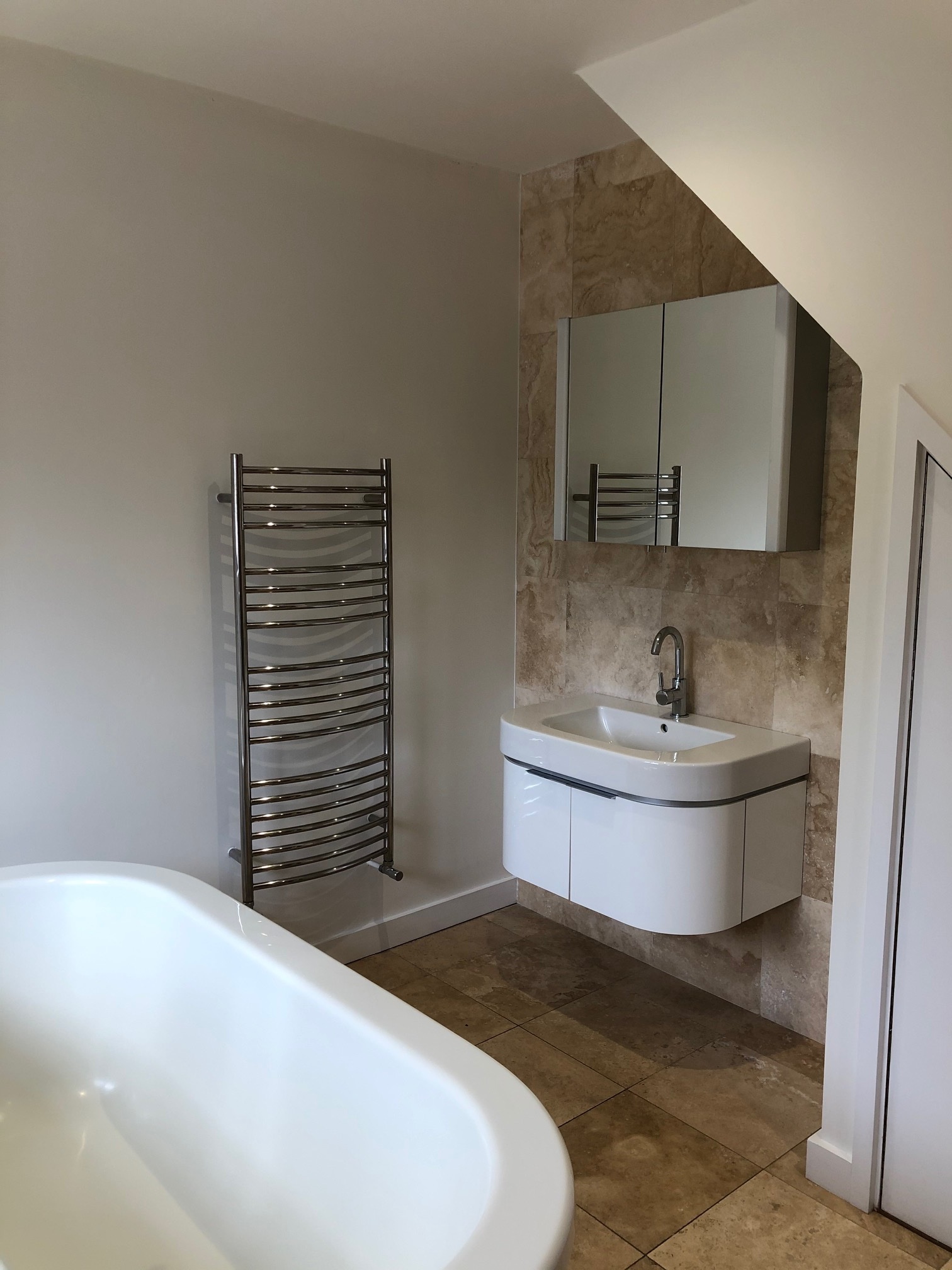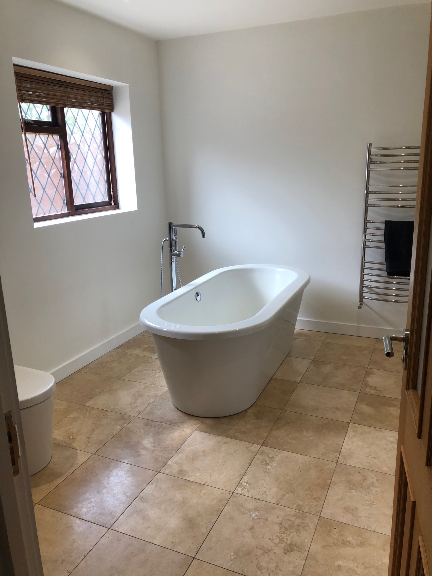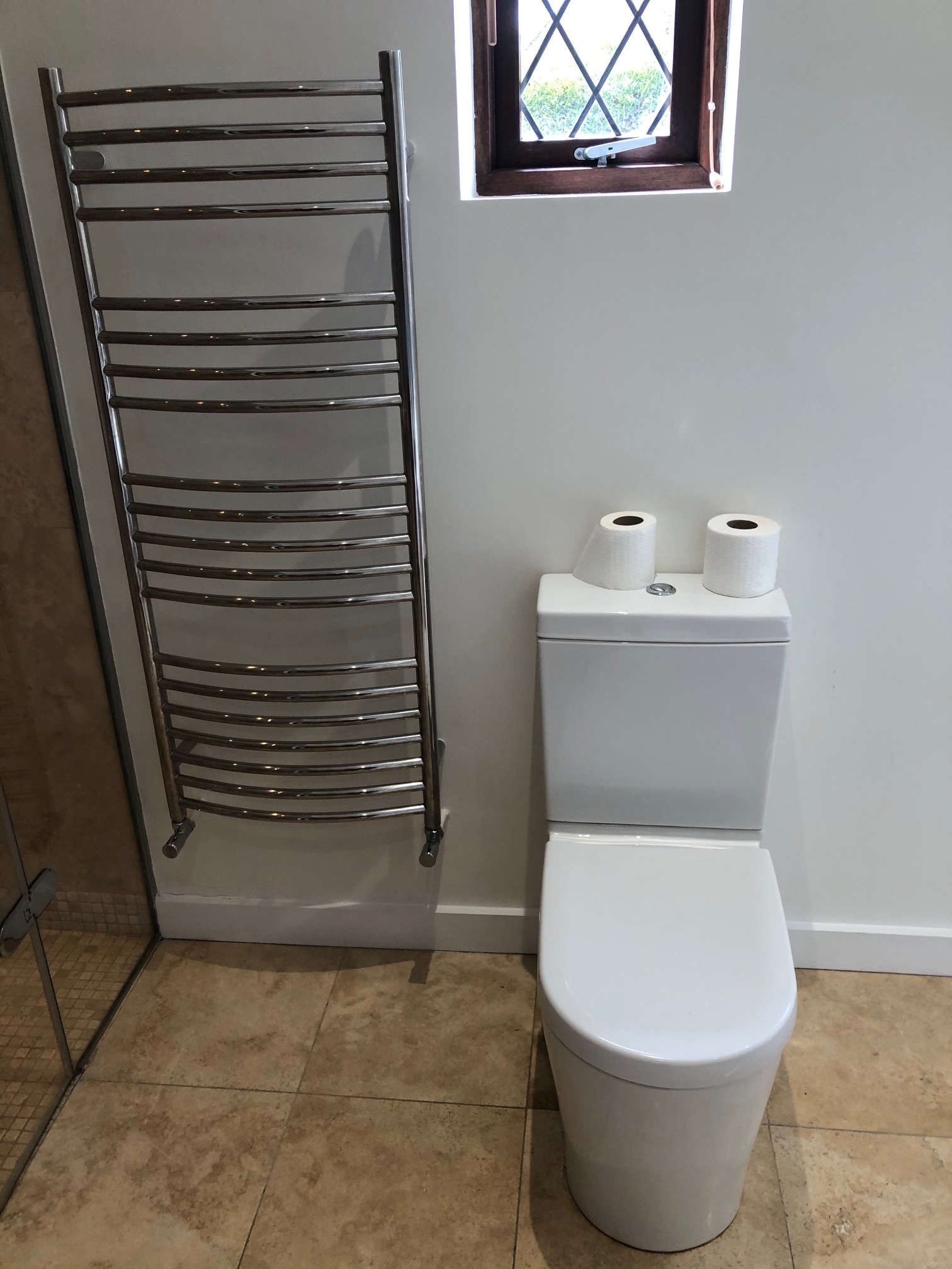 BATHROOM: Comprising WC, hand basin, double shower and free standing bath with shower attachment.