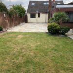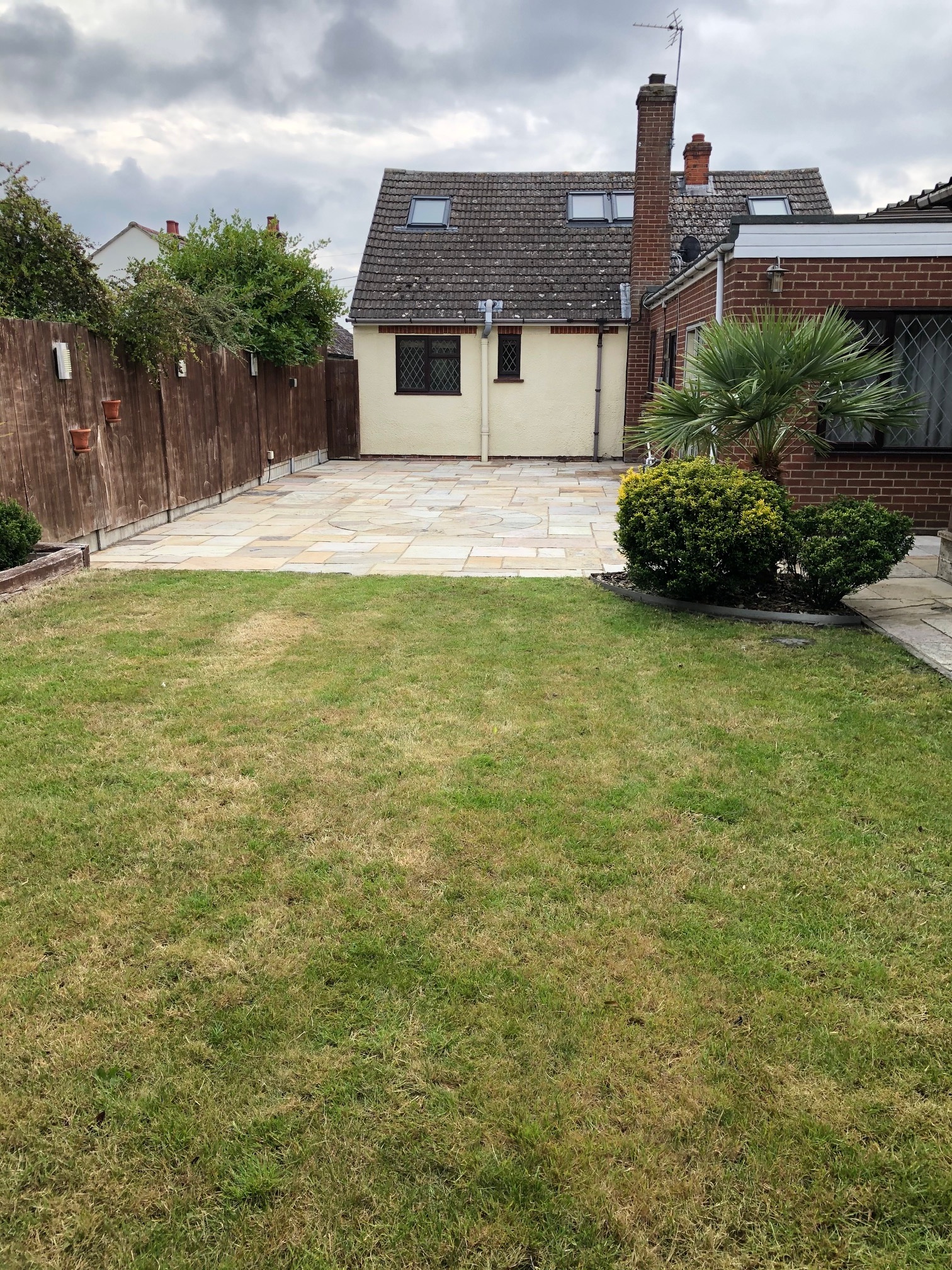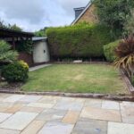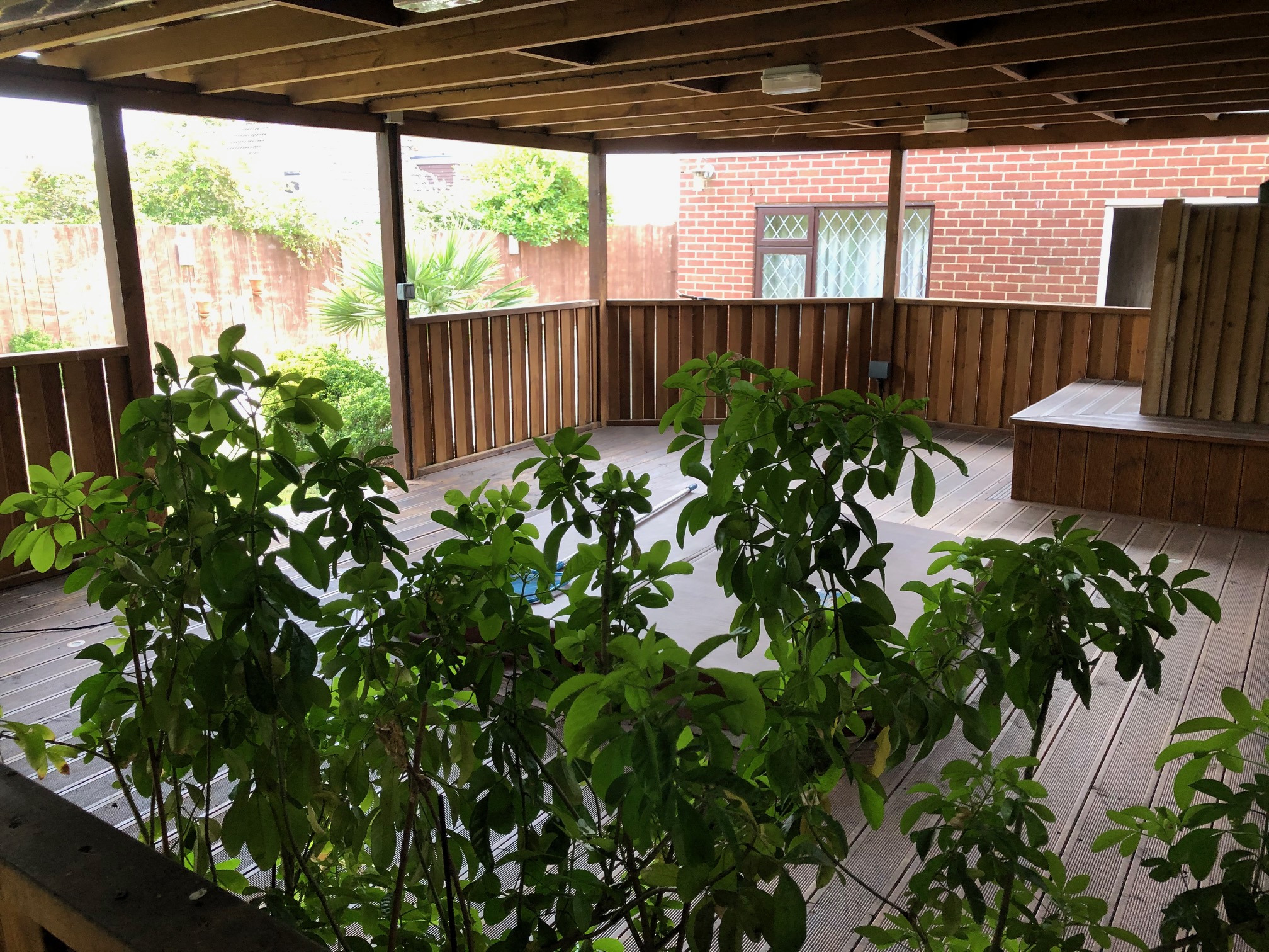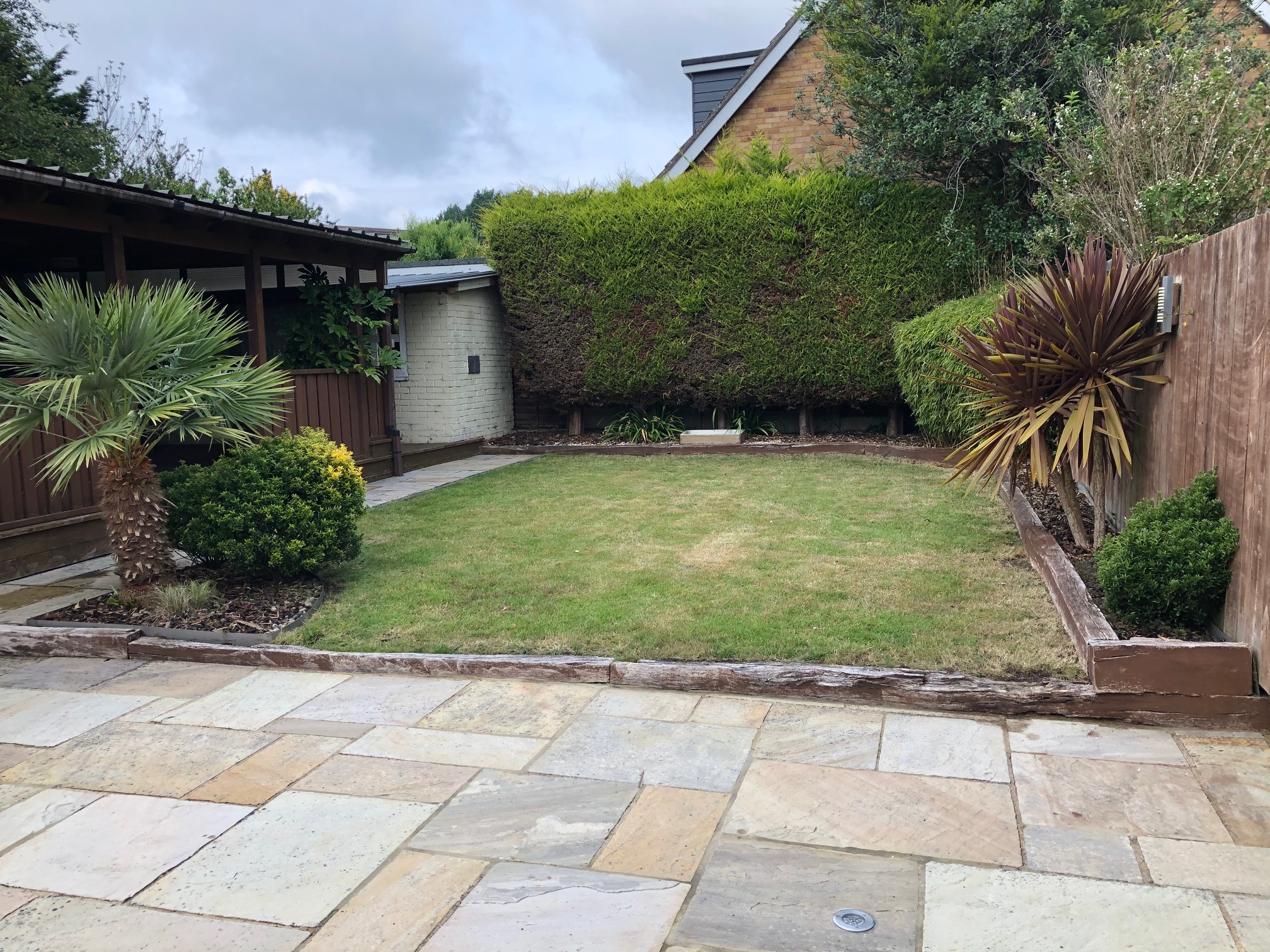 GARDEN: Enclosed by panelled fencing and hedge borders, paved patio area, laid lawn, under covered entertainment area.